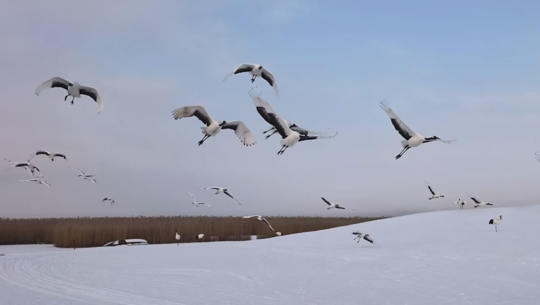 雪(xuě)天一(yi)色鶴舞雪(xuě)原 丹頂鶴野化訓飛美景圈粉無數